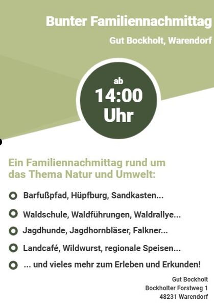 Ein halbes Jahrhundert aktives Vereinsleben und waidgerechte Hege ist Anlass genug, um einen feierlichen Tag im Zeichen der Natur und Umwelt zu gestalten und auszurichten. Am 30.08.2025 ab 14:00 Uhr auf dem Gut Bockholt, Warendorf werden wir in den bunten Familiennachmittag für Jung und Alt starten. Viele Attraktionen zum Mitmachen werden hier geboten, wie einen Barfußpfad, eine Hüpfburg oder die rollende Waldschule, ebenso wie diverse Highlights zum Erkunden und Erleben, wie fachliche Waldführungen, spannender Jagdhundeeinsatz oder interessante Falknervorführungen und vieles mehr. Für Speisen und Getränke ist natürlich auch gesorgt.